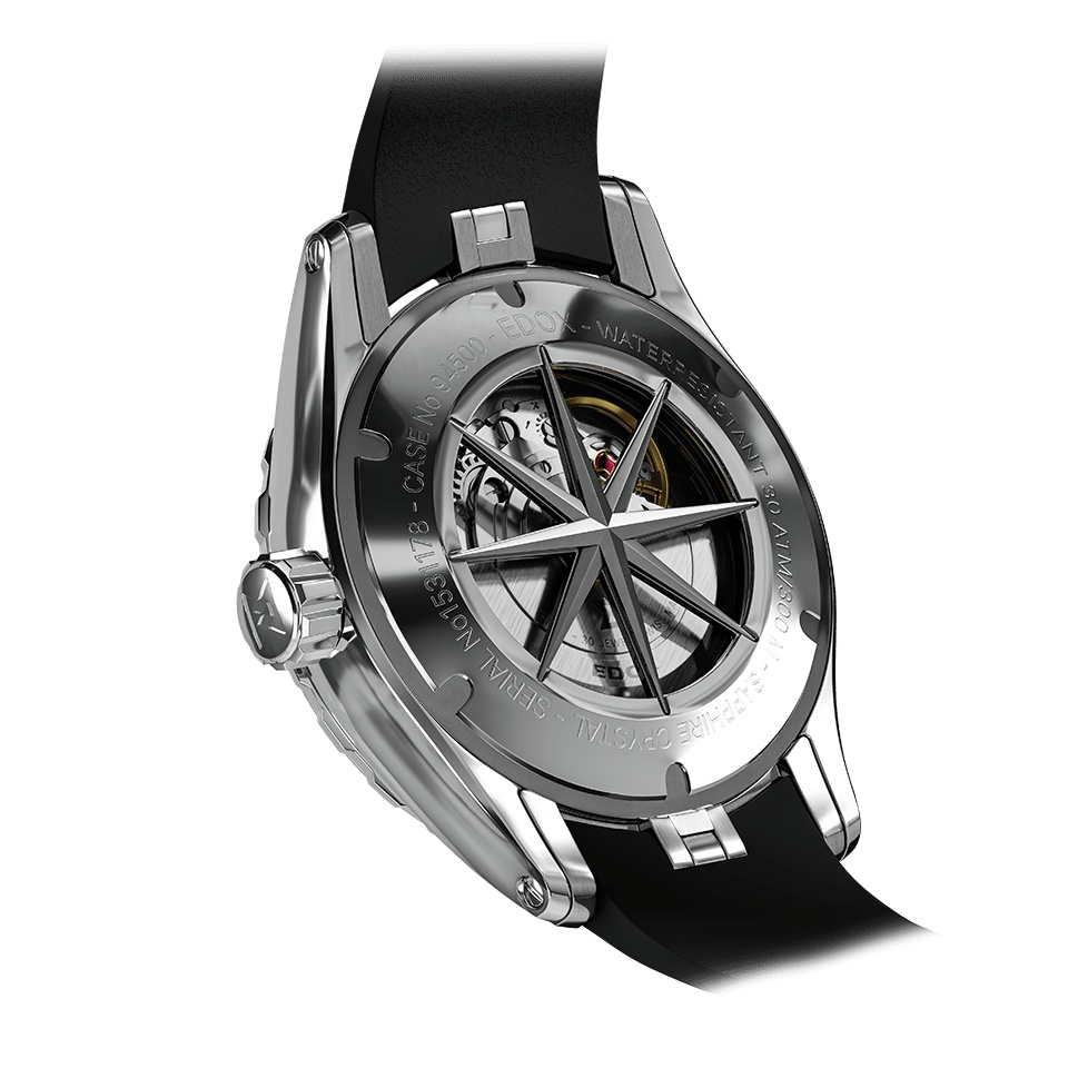 Verfeinert und doch entschlossen, vereint die 40-mm-Grand Ocean Power Reserve nahtlos Handwerkskunst und Funktionalität. Angetrieben vom SW 279-1 Uhrwerk, verfügt sie über eine Gangreserveanzeige bei 6 Uhr und einen kleinen Sekundenzähler bei 9 Uhr, was für optimalen Ausgleich sorgt. Die samtige Textur des Zifferblatts, umgeben von einer feinen kreisförmigen Streifung, spiegelt den Rhythmus der Gezeiten wider. Getreu ihrer Tradition behält die Grand Ocean Kollektion ihr ikonisches Triple-Horn-Gehäusedesign bei, ein Zeichen der Ingenieurskunst von EDOX. Die anspruchsvolle Mehrkomponentenkonstruktion spiegelt die Komplexität des Meeres wider – geschichtet, kraftvoll und sich ständig verändernd. Auf dem Gehäuseboden verstärkt eine fein gravierte Windrose die Verbindung der Kollektion zur maritimen Präzision, während Einblicke in das Uhrwerk durch sein durchbrochenes Design uns an die unaufhörliche Bewegung erinnern, die sowohl Zeit als auch Gezeiten definiert.
