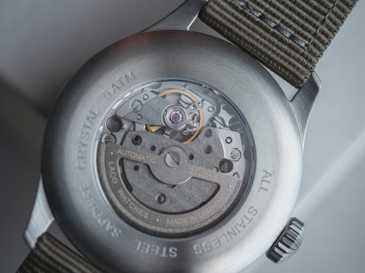Das zuverlässige Automatikwerk Laco 2S (Miyota 82SO mit Sekundenstopp) sorgt für präzise Zeitmessung, während Superluminova C3 auf Zeigern, Zahlen und Indizes für perfekte Ablesbarkeit bei Tag und Nacht sorgt. Das graue Nylonarmband mit Edelstahlschließe und Laco-Logo bietet höchsten Tragekomfort und unterstreicht den sportlich-eleganten Charakter dieser Uhr.