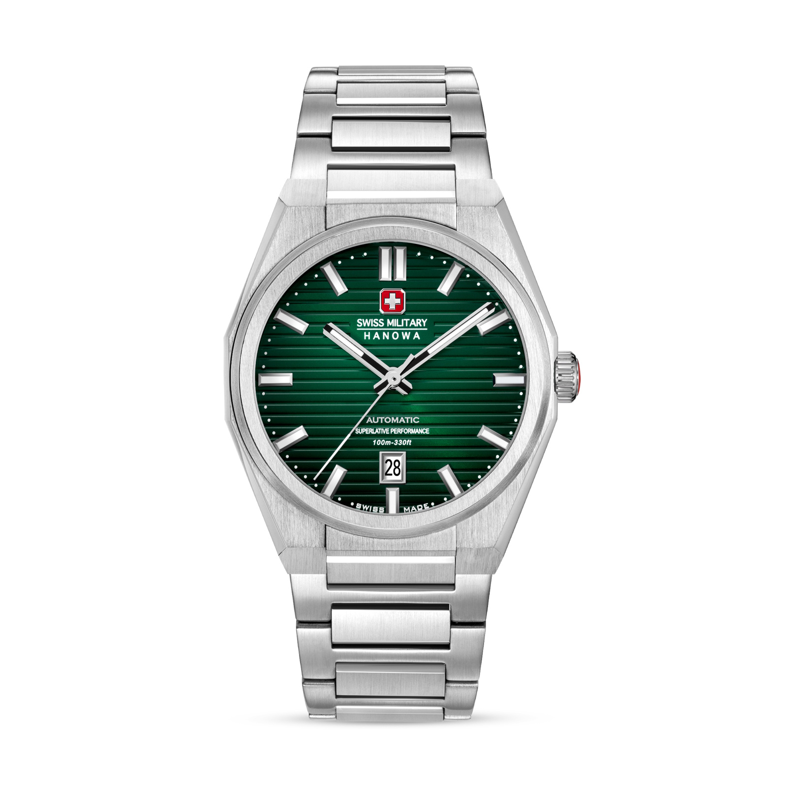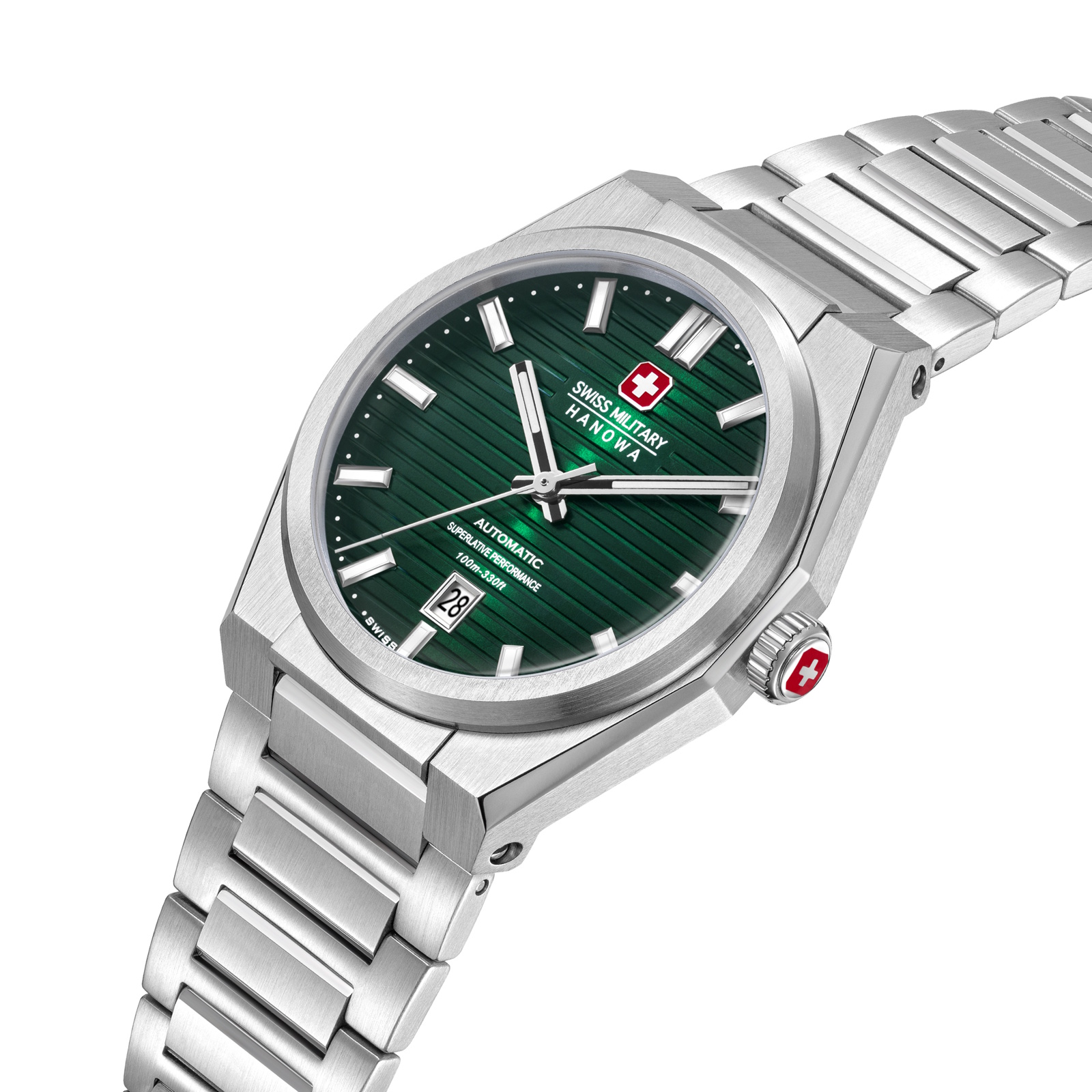 Bold minimalism defines Swiss Military Hanowa Avalanche. It combines strength and elegance with its angular case. The green dial features a sleek linear pattern, while the prominent case and bracelet add depth. Powered by an automatic self-winding movement, it includes a screw-down crown and a see-through mineral case back. Clean, casual, and classy, the Avalanche stands out with understated confidence.