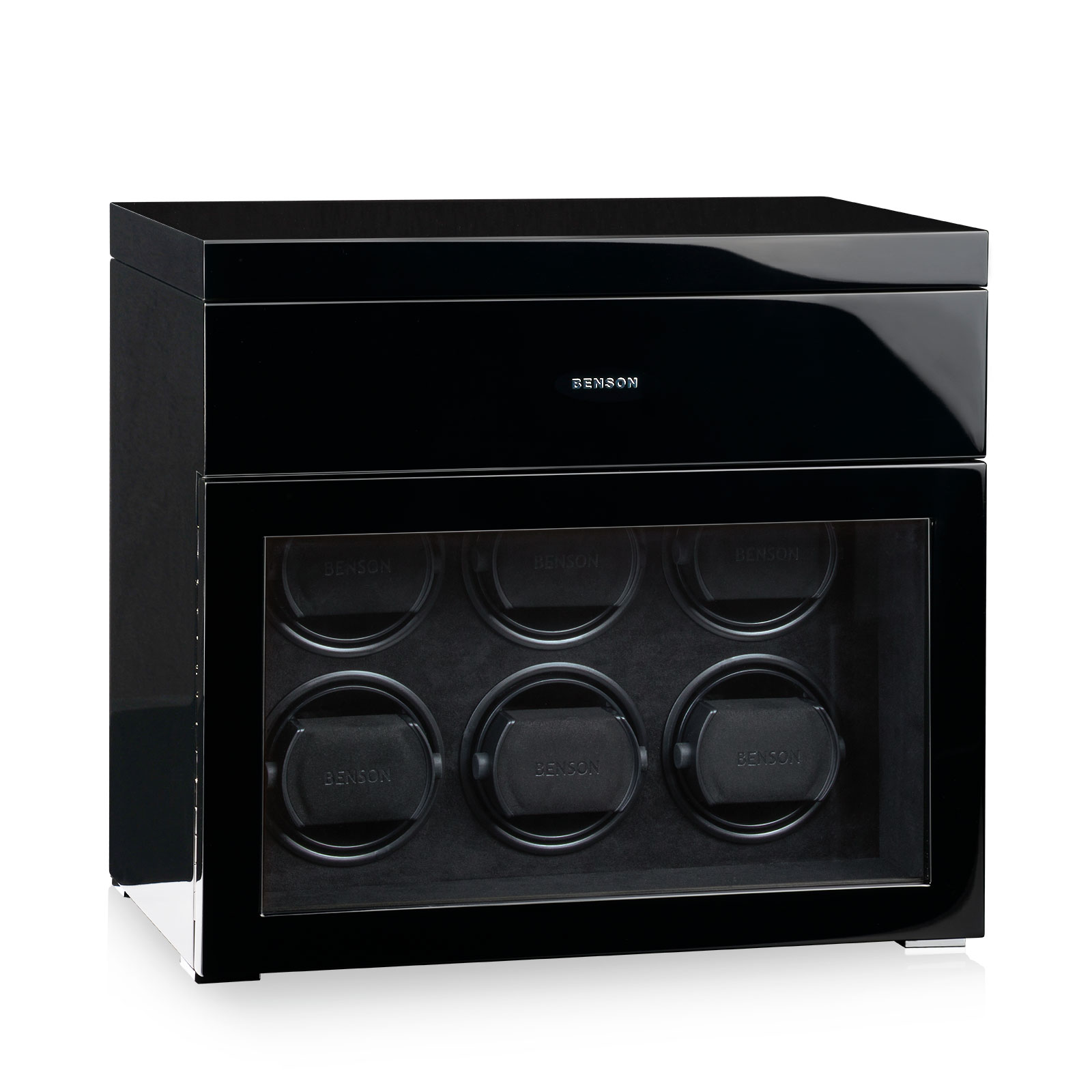 Die neue Black Series II ist die luxuriöseste Linie der Marke Benson. Diese speziellen handgefertigten Uhrenbeweger kombinieren die neueste Benson-Technik und hochwertige Verarbeitung mit einem stilvollen Design. Mit zusätzlichem Stauraum für weitere Uhren, 12 Farbschichten, LED-Beleuchtung, Auto-Stopp Funktion, Soft-Close-Cover und innovativem Touchscreen bieten die Uhrenbeweger der Black Series viel Funktionalität und Qualität.